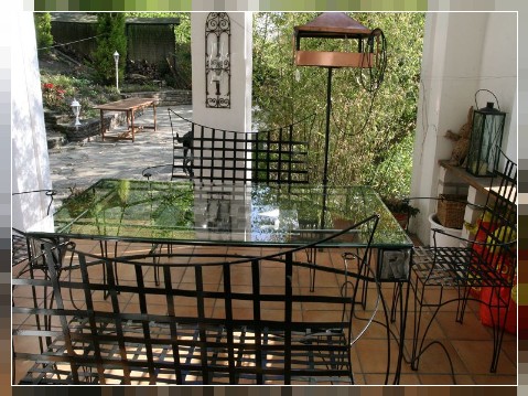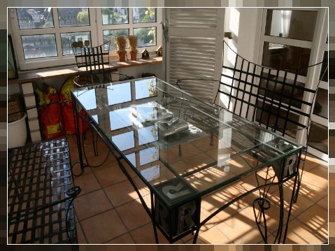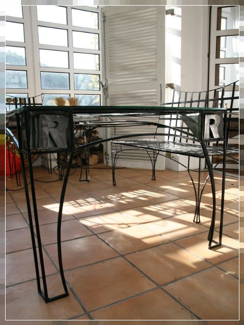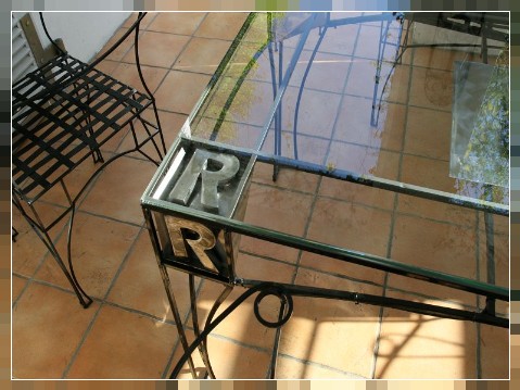 Schmiedeeiserner Tisch mit unterlegtem Namenszug in Vollschrift in der Mitte des Tisches, sowie der Anfangsbuchstabe in jeder Ecke.