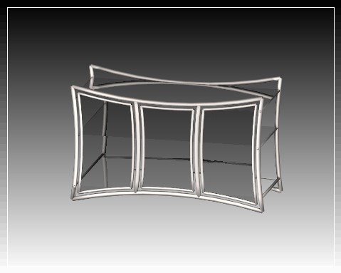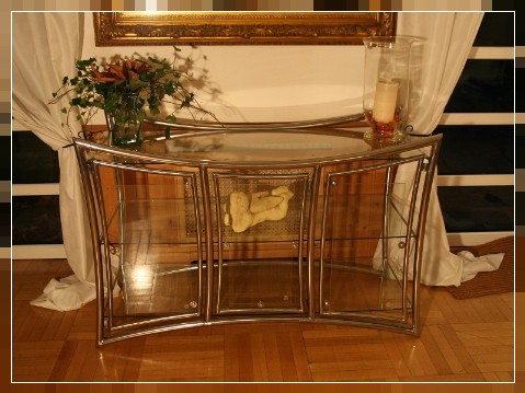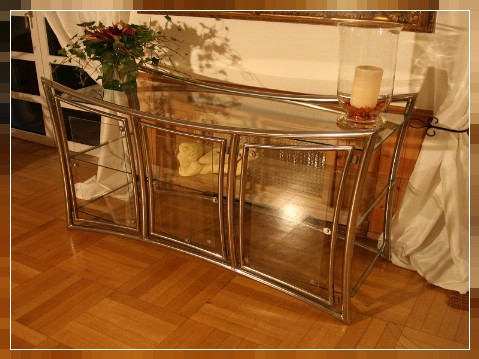 Vitrinenkommode1,5 m x 90 cm HöheSchlicht, doch ein Blickfang durch seine geschwungenen Linien.Hochglänzender Chromstahl vereint mit Glas.3 Etagen Glasauflage, Türen verglast